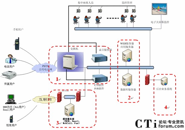 基于PBX交換機(jī)實現(xiàn)語音交換和ACD排隊、基于板卡實現(xiàn)語音資源、基于CTI中間件實現(xiàn)CallCenter功能、基于先進(jìn)技術(shù)實現(xiàn)增強(qiáng)功能,共同搭建呼叫中心平臺。