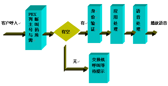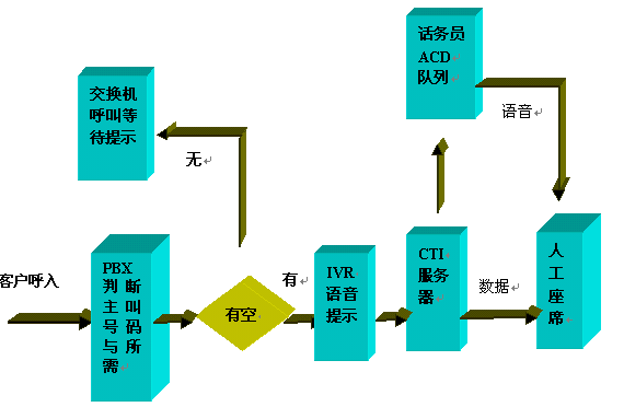 呼入一般都先通過ACD進(jìn)行排隊(duì),然后根據(jù)用戶選擇進(jìn)入子系統(tǒng),流程圖如下: