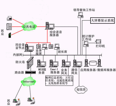 本系統(tǒng)物理結(jié)構(gòu)由語音交換機(jī)、座席分流器、呼叫管理服務(wù)器(CTI服務(wù)器)、IVR(交互式語音應(yīng)答)/IFR(交互式傳真應(yīng)答、業(yè)務(wù)代表座席、調(diào)度席、統(tǒng)計(jì)維護(hù)管理工作站、數(shù)據(jù)庫/應(yīng)用服務(wù)器、通信網(wǎng)關(guān)服務(wù)器、業(yè)務(wù)網(wǎng)關(guān)服務(wù)器、錄音工作站、領(lǐng)導(dǎo)查詢工作站、大屏幕顯示系統(tǒng)、網(wǎng)絡(luò)系統(tǒng)等構(gòu)成。