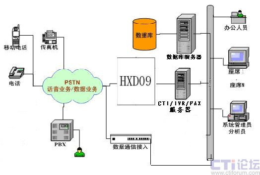 “系統(tǒng)”主要由以下幾部分組成:HXD09語音交換機、CTI Server服務(wù)器、數(shù)據(jù)庫系統(tǒng)、業(yè)務(wù)處理系統(tǒng)以及座席(業(yè)務(wù)代表)、呼叫管理系統(tǒng)、呼叫監(jiān)控系統(tǒng)幾項業(yè)務(wù)組成。