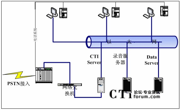 消費(fèi)者撥打訂購電話,經(jīng)PSTN接入到呼叫中心交換機(jī),由CTI服務(wù)器(CTI Server)通過交換機(jī)將話務(wù)分配到相應(yīng)空閑坐席。坐席端記錄訂購信息及消費(fèi)者信息,并將信息存入數(shù)據(jù)服務(wù)器(DataServer)。交換機(jī)對通話進(jìn)行全程錄音,并存入錄音服務(wù)器。同時可把進(jìn)入系統(tǒng),但未排隊(duì)到坐席的話務(wù)數(shù)據(jù)記錄存入數(shù)據(jù)庫服務(wù)器,以便回訪。
