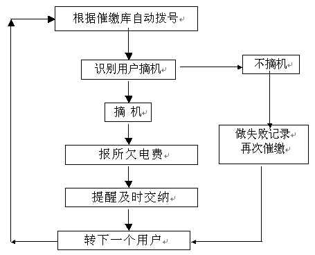 。。催費工作是由指定的欠費數(shù)據(jù)文件(或欠費數(shù)據(jù)庫)中提取用戶電話號碼和欠費金額,自動順序向各欠費用戶撥號,撥通后自動播放催費通知并通報欠費金額數(shù)。系統(tǒng)自動統(tǒng)計通話結(jié)果,系統(tǒng)對未應答用戶會自動重復多次撥叫。
