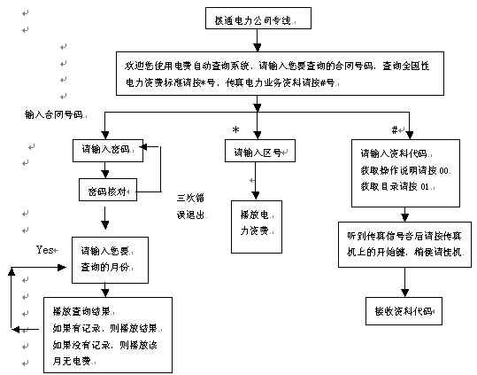 。。當用戶得知需要繳納電費時,可撥打電力公司查詢熱線,聽到問候語后輸入合同號碼,系統(tǒng)即可自動播放用戶查詢月份的電費發(fā)生情況。