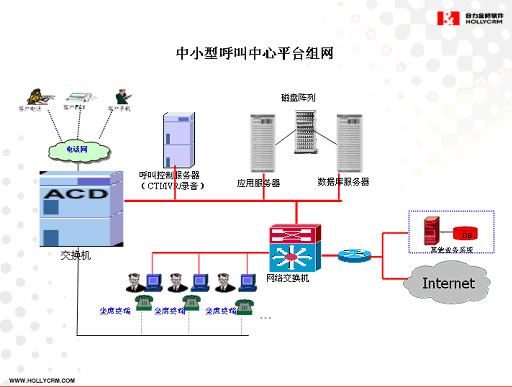 從組網(wǎng)模式上,中小型呼叫中心平臺比較簡單,利用中小型呼叫中心平臺實(shí)現(xiàn)前端接入、IVR、錄音和排隊(duì)等功能,利用專用軟件在外置的PC(或PC服務(wù)器)上實(shí)現(xiàn)系統(tǒng)配置和CTI應(yīng)用。結(jié)合后端業(yè)務(wù)應(yīng)用平臺,就可以實(shí)現(xiàn)呼叫中心的基本功能。