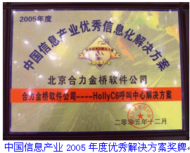 2006年1月10日,北京。中國計(jì)算機(jī)用戶協(xié)會(huì)"2005年度企業(yè)及產(chǎn)品頒獎(jiǎng)典禮"在世紀(jì)金源大飯店隆重召開。在Call Center(呼叫中心)及CRM(客戶關(guān)系管理)領(lǐng)域位居業(yè)界領(lǐng)先地位的HOLLYCRM(合力金橋軟件)公司自主知識(shí)產(chǎn)權(quán)的HollyC6呼叫中心解決方案再度成為業(yè)界關(guān)注焦點(diǎn),榮獲"中國信息產(chǎn)業(yè)2005年度優(yōu)秀解決方案"大獎(jiǎng)。