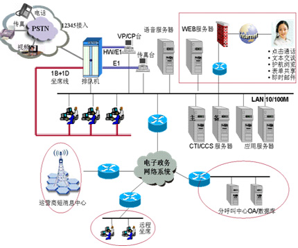 華為12345政府熱線系統(tǒng)解決方案,是一個(gè)集語音技術(shù)、通信技術(shù)、計(jì)算機(jī)網(wǎng)絡(luò)、數(shù)據(jù)庫(kù)技術(shù)于一體,支持電話、傳真、電子郵件、Web等多種媒體接入方式的呼叫中心解決方案。該系統(tǒng)充分考慮了政府服務(wù)熱線的現(xiàn)狀及存在的問題,并結(jié)合了政府特點(diǎn)的運(yùn)作模式,是華為公司在多年呼叫中心開發(fā)合作工作經(jīng)驗(yàn)積累基礎(chǔ)上推出的解決方案。整個(gè)系統(tǒng)整體結(jié)構(gòu)如下: