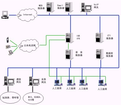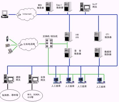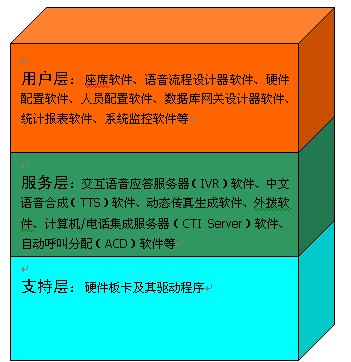 2、服務(wù)層:交互語(yǔ)音應(yīng)答服務(wù)器(IVR)軟件、中文語(yǔ)音合成(TTS)軟件、動(dòng)態(tài)傳真生成軟件、外撥軟件、計(jì)算機(jī)/電話(huà)集成服務(wù)器(CTI Server)軟件、自動(dòng)呼叫分配(ACD)軟件等等。