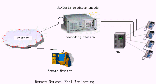如上圖,在Recording Station 中裝有支持MVIP總線的Ai-Logix系列錄音卡.Recording Station通過(guò)Ai-Logix系列錄音卡搭線在被監(jiān)聽的電話線上,采用高阻錄音技術(shù),取得通話的錄音數(shù)據(jù),再由Internet實(shí)時(shí)傳給Remote