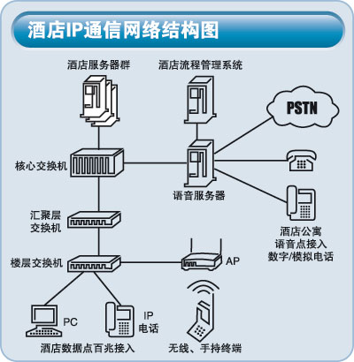 由于IP通信對帶寬和系統(tǒng)性能的要求并不高,因此可以充分利用酒店原有網(wǎng)絡(luò)架構(gòu),重新劃分VLAN和無線局域網(wǎng)資源分配,同時(shí)滿足IP電話的通話需求、客房寬帶網(wǎng)絡(luò)的使用,以及無線接入、移動辦公等需求。即獲得優(yōu)化的應(yīng)用又保護(hù)了用戶的投資。