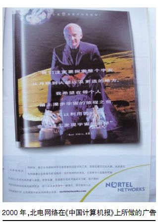 2000年,北電網(wǎng)絡(luò)在《中國計算機報》上所做的廣告 1995年,北電開始從電話制造公司向網(wǎng)絡(luò)設(shè)計、構(gòu)建及集成公司的演變。起初,業(yè)界分析人士對此予以奚落,認為這是一家電信商膚淺的裝飾門面之舉。一位分析師曾尖銳地稱之為“一群四十多歲的人穿著跳迪斯科的衣服”。