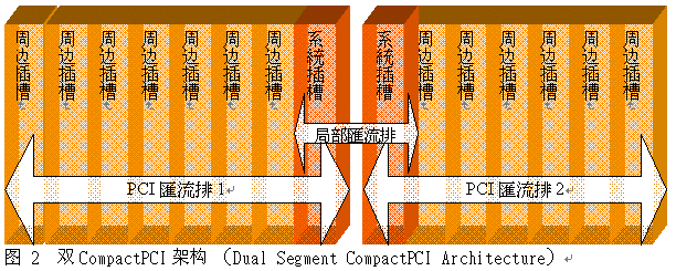 PICMG 2.0 CompactPCI系統(tǒng)是由一組或多組CompactPCI 總線所組成,每個總線最多可達8個CompactPCI板卡插槽,其中包含一個系統(tǒng)插槽(system slot)與最多達7個外圍插槽(peripheral slot)。PCI總線是作為該總線內(nèi)插槽之間的主要通訊途徑,在這個架構(gòu)下,PCI總線與系統(tǒng)插槽是一個可能的故障單點,故障的周邊插槽會讓整個PCI總線停止作用而阻礙了其它任一插槽之間的通訊。這種故障單點成為CompactPCI采用高可靠度應用的一個主要障礙,早期的CompactPCI 高可靠度系統(tǒng)架構(gòu)必須克服PCI總線單點故障的限制,典型的解決方法則是添加第二個CompactPCI 總線且讓此二個總線的功能相同。圖2顯示雙CompactPCI 總線架構(gòu)的范例。