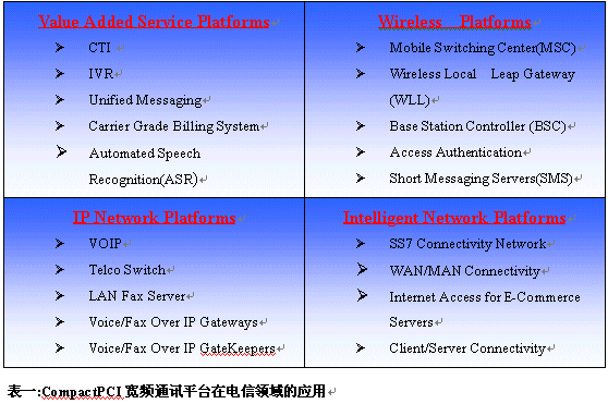 標(biāo)準(zhǔn)之眾多解決方案,使設(shè)備供貨商與服務(wù)供貨商能根據(jù)自己需要,結(jié)合IP、ATM、IN、TDM眾家之長(zhǎng),建設(shè)開(kāi)放式電信等級(jí)的寬頻網(wǎng)絡(luò)架構(gòu),不但降低網(wǎng)絡(luò)建設(shè)及運(yùn)行維護(hù)成本,更能快速提供新加值服務(wù)、搶占新市場(chǎng)、滿(mǎn)足用戶(hù)不斷變化的需求。CompactPCI寬頻通訊平臺(tái)除了加快網(wǎng)絡(luò)基礎(chǔ)建設(shè)的建置速度,更提供具彈性、可靠性及擴(kuò)充性的網(wǎng)絡(luò)運(yùn)算解決方案,發(fā)展出各種為電信服務(wù)業(yè)者所量身訂作的高密度IP運(yùn)算關(guān)鍵核心。