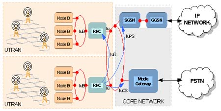 UTRAN為用戶端的移動(dòng)電話、其它無線設(shè)備(如PDA, 便攜計(jì)算機(jī)等)提供到有線網(wǎng)絡(luò)的連接,它包括B節(jié)點(diǎn)(Node