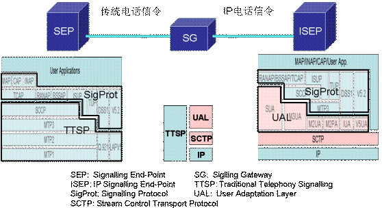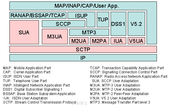 圖中粉紅色部分為SIGTRAN的協(xié)議棧,在它們之上的是對應的電話信令協(xié)議。SIGTRAN的協(xié)議棧分為2層:一層是SCTP,它提供多個流的,可靠的數據傳輸,用戶數據的捆綁和分段,阻塞和流量控制,防止"拒絕服務"和"偽裝"的攻擊等功能。另一層是用戶適配層,圖中由SUA、M3UA、M2UA、M2PA、IUA和V5UA五個適配模塊所組成,它們分別來滿足各種電話信令協(xié)議適配的要求。