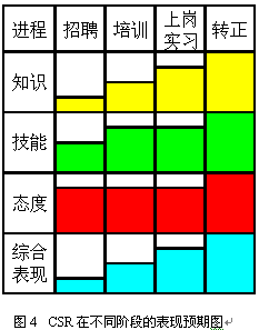 即使經(jīng)過規(guī)范的上崗培訓與考核,新員工通常也只達到老員工70%左右的表現(xiàn)。因此制定明確的實習期,在實習期間加強指導和培養(yǎng)是非常重要的。通常經(jīng)過3個月的實習,新員工已經(jīng)可以達到一個標準,這時便可以轉(zhuǎn)正了。圖3和圖4表現(xiàn)了不同階段對CSR的不同預期,以及不同階段的主要工作。