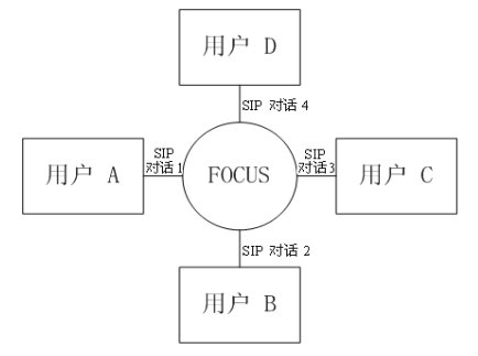 緊耦合會(huì)議的邏輯架構(gòu)圖如圖三所示。會(huì)議中的核心是“會(huì)議中心(conference focus)”,每一個(gè)會(huì)議都有一個(gè)會(huì)議中心,由一個(gè)URI標(biāo)識(shí),用戶(hù)通過(guò)聯(lián)系這個(gè)URI參加到一個(gè)會(huì)議中去。會(huì)議中心和用戶(hù)之間的拓?fù)浣Y(jié)構(gòu)為星性結(jié)構(gòu)。會(huì)議中心為用戶(hù)提供并維持一個(gè)信令連接,并且可以執(zhí)行會(huì)議策略,實(shí)現(xiàn)對(duì)會(huì)議的控制和管理。