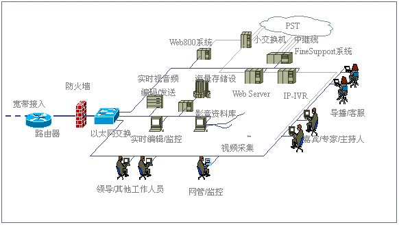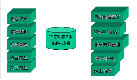 經(jīng)過對(duì)比分析,我們發(fā)現(xiàn),目前國際國內(nèi)市場(chǎng)上很多客戶服務(wù)產(chǎn)品,大都僅僅完成客戶服務(wù)的一部分。北極星“IP互動(dòng)客戶服務(wù)中心解決方案”則引入互動(dòng)客戶服務(wù)(ICS:Interactive Customer Service)系統(tǒng)以及數(shù)碼互動(dòng)直播的概念,形成了由視頻點(diǎn)播、網(wǎng)上路演、語音和文字交互、IP客戶服務(wù)中心、Web800語音電話、實(shí)時(shí)服務(wù)中心、專家實(shí)時(shí)在線、客戶關(guān)系管理、在線尋呼系統(tǒng)和客戶社區(qū)服務(wù)系統(tǒng)等全方位的服務(wù)內(nèi)容。該方案主要基于IP架構(gòu),系統(tǒng)擴(kuò)展性非常靈活,系統(tǒng)體現(xiàn)的客戶服務(wù)思想非常能夠滿足我們的需求。2001年3月,經(jīng)過一段時(shí)間的試運(yùn)行后,我們正式推出了這套“IP互動(dòng)客戶服務(wù)”系統(tǒng)。