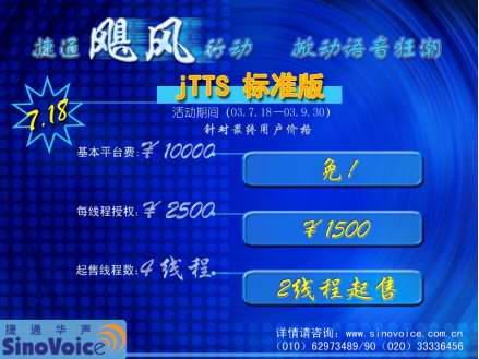 2003年7月18日,北京捷通華聲語(yǔ)音技術(shù)有限公司正式發(fā)布捷通華聲語(yǔ)音合成技術(shù) “jTTS標(biāo)準(zhǔn)版”。為慶祝“jTTS標(biāo)準(zhǔn)版”的正式上市,為期近三個(gè)月,推廣“jTTS標(biāo)準(zhǔn)版”的捷通“颶風(fēng)行動(dòng)”也在同一時(shí)間正式啟動(dòng)! 捷通“颶風(fēng)行動(dòng)”的宗旨--用全新的產(chǎn)品、全方位的服務(wù)、最具競(jìng)爭(zhēng)力的價(jià)格與所有CTI領(lǐng)域的企業(yè)合作,開啟面向中小型CTI系統(tǒng)語(yǔ)音應(yīng)用的市場(chǎng)大門,為CTI產(chǎn)業(yè)發(fā)展提供持久動(dòng)力支持!
