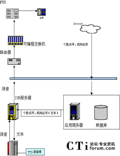 技術(shù)實(shí)現(xiàn)上,證券交易所可從網(wǎng)上下載個(gè)股點(diǎn)評(píng)信息或熱門(mén)個(gè)股信息,之后將這些信息的文本傳遞給IVR服務(wù)器,IVR會(huì)通過(guò)調(diào)用TTS服務(wù)器得到這些信息的語(yǔ)音流,之后就可以在坐席上播放這些信息的語(yǔ)音了。如圖所示: