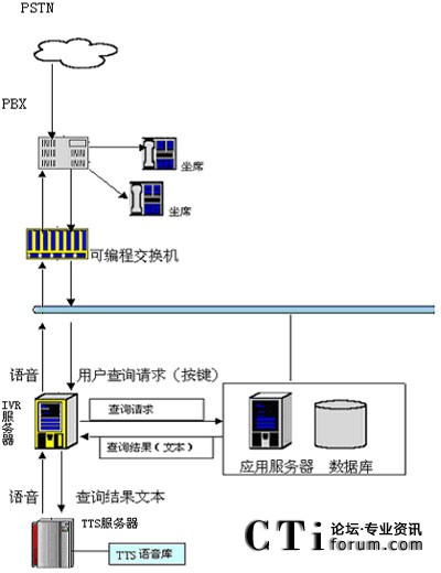 在技術(shù)上,用戶可以通過(guò)電話提交他的查詢請(qǐng)求(比如使用按鍵方式),IVR服務(wù)器收到請(qǐng)求后會(huì)向其他應(yīng)用服務(wù)器提交此查詢請(qǐng)求,當(dāng)IVR得到查詢結(jié)果后,他會(huì)將文本形式的查詢結(jié)果交給jTTS服務(wù)器,jTTS服務(wù)器會(huì)返回查詢結(jié)果的語(yǔ)音形式,最終語(yǔ)音會(huì)在坐席上播放,用戶就可以聽(tīng)到他剛才所要查詢的信息。(如圖所示)