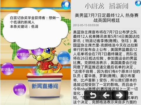CTI論壇(ctiforum)5月17日消息(記者 歐陽(yáng)): 2012年5月9日,中國(guó)第一個(gè)全方位智能交互手機(jī)助手“小唐龍”正式上線,小唐龍是一個(gè)基于Android系統(tǒng)的智能手機(jī)助手,它可隨時(shí)隨地幫助手機(jī)用戶進(jìn)行聊天、歌曲點(diǎn)播、聽(tīng)新聞、地圖導(dǎo)航、互聯(lián)網(wǎng)信息查詢(xún)等多方面服務(wù),其中《唐龍新聞》以新穎獨(dú)特成為小唐龍的閃亮點(diǎn)。當(dāng)拿起手機(jī)對(duì)著“小唐龍”說(shuō),“聽(tīng)新聞”,“小唐龍”的播報(bào)便即刻開(kāi)始——天下大事早知道,由我唐龍給您報(bào),我們來(lái)看今天的唐龍新聞。