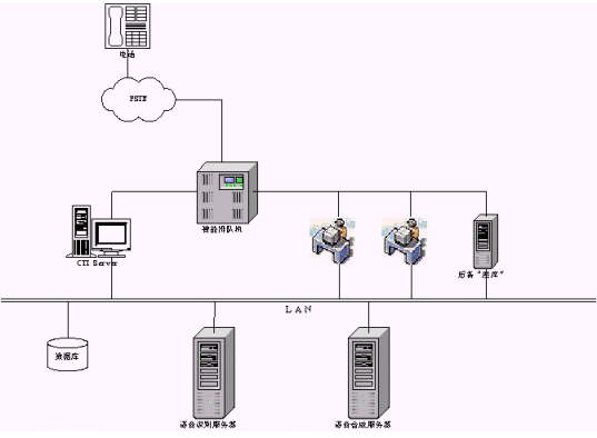 IVR模式是最常見的一種模式,這種模式也可以結(jié)合應(yīng)用到前端以交換機接入的系統(tǒng)中去,在系統(tǒng)的IVR服務(wù)流程上,做出相應(yīng)的修改,加入語音識別技術(shù),同樣可以得到成功應(yīng)用。另外一種模式暫且稱它為后備模式,該模式一個主要的特點是放在后端,比如在有座席接聽的情況下,采用語音識別技術(shù)的系統(tǒng)不被激活,也就是系統(tǒng)不給派線。當系統(tǒng)繁忙,而座席都占用的情況下,系統(tǒng)派線到采用語音識別技術(shù)的系統(tǒng),如同一個備用的座席。在這樣一個"座席"的軟件設(shè)計上,如同與人的交談一樣,系統(tǒng)也提出正常的詢問,但必須強調(diào)引導(dǎo)用戶來按照事先設(shè)定好的流程進行。這樣可以保證系統(tǒng)的接通率,特別是在一些對接通率和服務(wù)及時性要求比較高的場合采用,典型的代表如電信114查號臺和移動的1860客服中心,這些系統(tǒng)往往是隨著用戶急劇增加,撥打量也在穩(wěn)步上升,而呼叫響應(yīng)要求及時。系統(tǒng)拓撲結(jié)構(gòu)如下圖示。