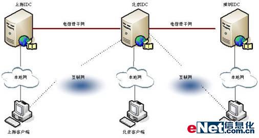 上圖為單服務器和多服務器的部署比較(虛線為單服務器的訪問模式),可以看到,使用多服務器部署后,客戶端可以使用本地網(wǎng)進入系統(tǒng),對于網(wǎng)絡質量優(yōu)化有很大的優(yōu)勢。另外,服務器間音視頻流的傳輸將不會出現(xiàn)數(shù)據(jù)冗余現(xiàn)象,對于減少骨干網(wǎng)的壓力也有益處。
