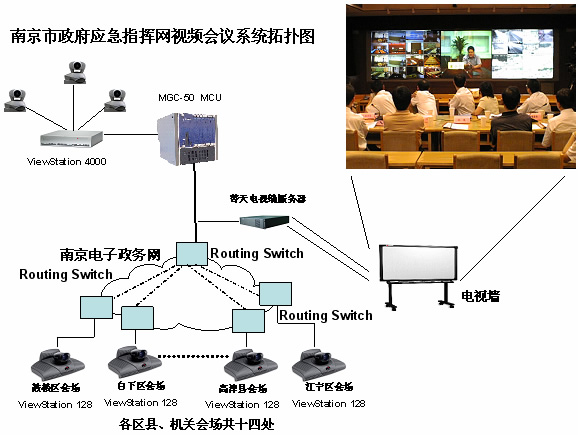南京市政府利用南京市電子政務(wù)網(wǎng)的網(wǎng)絡(luò)基礎(chǔ),建立政府視頻會(huì)議指揮系統(tǒng),連接14個(gè)區(qū)縣政府及機(jī)關(guān),會(huì)議帶寬為768Kbps。利用本系統(tǒng)實(shí)現(xiàn)快速召集全市關(guān)鍵部門的會(huì)議。