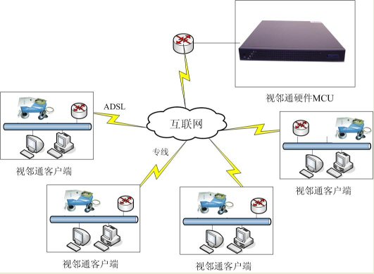 視鄰?fù)ㄏ到y(tǒng)采用軟硬結(jié)合的解決方案思想進行設(shè)計,主要組成是一個MCU,依據(jù)點數(shù)配備軟件終端,軟件終端含一個帶云臺可遠程遙控的攝像頭,以及一個自帶回音消除的全向麥與小音箱。和傳統(tǒng)323產(chǎn)品比較,部署簡單,靈活,在互聯(lián)網(wǎng)表現(xiàn)效果良好,并具備強大的數(shù)據(jù)功能,同時價格更具競爭力,而純軟視頻會議系統(tǒng)相比,則在穩(wěn)定性,清晰度上更勝一籌。