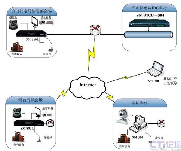 根據佛山供電局的需求特點,網絡及工程建設現(xiàn)狀,瑞福特為其定制了一套解決方案。整個方案軟硬結合,完全基于現(xiàn)有網絡基礎上,通過接入設備實現(xiàn)音、視頻及數(shù)據的實時交互傳輸。所有的設備組成如下:一臺4用戶的視頻服務器SM MCU 504,主要放置于電力局總部,在4個會議配備硬件終端使用SM 880L,另外桌面軟件終端使用SM 300。