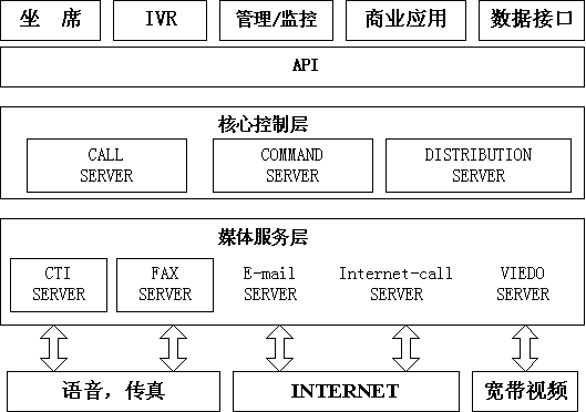 核心控制層由Call Server(呼叫控制) 、Command Server(命令服務(wù))、Distribution Server(路由服務(wù)) 組成。Call Server用于管理呼叫信息,維護(hù)整個系統(tǒng)呼叫的狀態(tài)機;Command Server負(fù)責(zé)命令的接收和轉(zhuǎn)發(fā);Distribution Server完成路由功能。