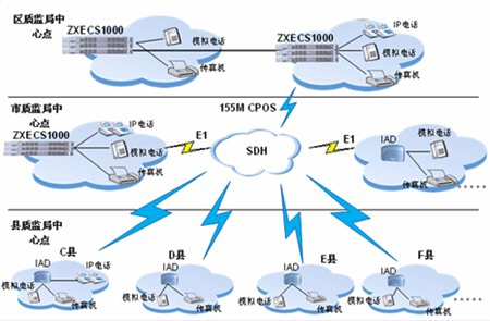 其它各接入節(jié)點(diǎn)采用IAD設(shè)備接入到ZXECS 1000,最大程度的降低了語(yǔ)音接入的成本,同時(shí)IAD靈活的擴(kuò)展性利于今后的升級(jí)。
