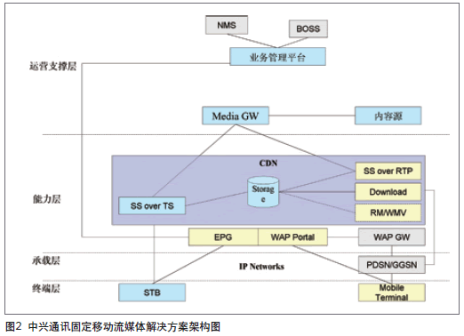 中興通訊的固定移動流媒體解決方案,是在充分比較兩網(wǎng)的異同點之后,構(gòu)架的全新方案,其組網(wǎng)架構(gòu)如圖2所示!