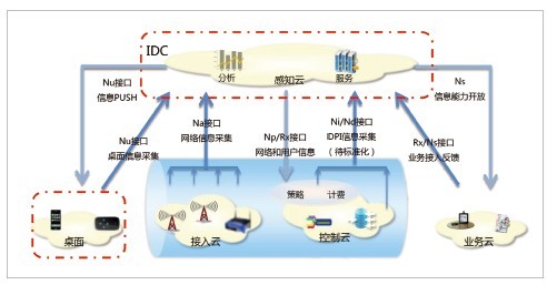 中興通訊增強(qiáng)端到端信息感知和開放接口,提出一套標(biāo)準(zhǔn)架構(gòu)如圖2所示,來實現(xiàn)整個網(wǎng)絡(luò)透明、可視。建設(shè)網(wǎng)絡(luò)信息采集體系,增強(qiáng)感知云的端到端分析能力;建立“桌面云-感知云”的云端一體化架構(gòu),提供網(wǎng)絡(luò)推送能力;感知云向終端開放網(wǎng)絡(luò)信息和能力,增強(qiáng)用戶感知網(wǎng)絡(luò)、定制個人體驗?zāi)芰;感知云向業(yè)務(wù)開放網(wǎng)絡(luò)信息和能力,拓展合作發(fā)展增值業(yè)務(wù)的能力。
