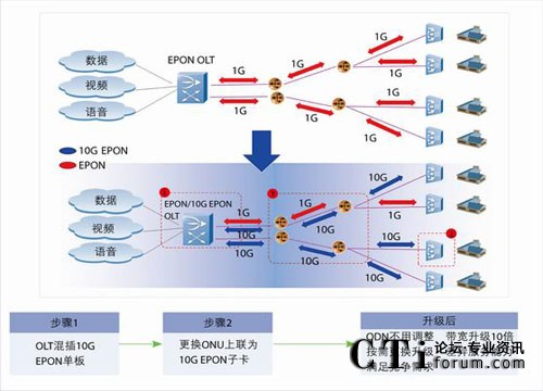 項(xiàng)目選取的試點(diǎn)小區(qū)建設(shè)于2006年,原來(lái)規(guī)劃的是每用戶6M帶寬。后期小區(qū)實(shí)裝率高,實(shí)際用戶超過(guò)1500戶,IPTV業(yè)務(wù)申請(qǐng)量提升后,出現(xiàn)了高峰時(shí)段IPTV點(diǎn)播業(yè)務(wù)不流暢、同時(shí)應(yīng)用IPTV和上網(wǎng)業(yè)務(wù)時(shí)網(wǎng)速過(guò)慢等問(wèn)題。而且當(dāng)湖北電信新推出10M~20M的新寬帶套餐時(shí),該小區(qū)用戶申請(qǐng)新套餐數(shù)量受限。該小區(qū)的寬帶接入網(wǎng)絡(luò)已經(jīng)明顯無(wú)法滿足用戶日益增長(zhǎng)的需求,寬帶提速正當(dāng)其時(shí)。選擇10G EPON,能夠簡(jiǎn)單兩步,將小區(qū)接入方式從EPON平滑升級(jí)為10G EPON,無(wú)需改變網(wǎng)絡(luò)結(jié)構(gòu),只需簡(jiǎn)單升級(jí)設(shè)備(見(jiàn)圖)。