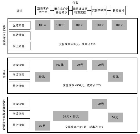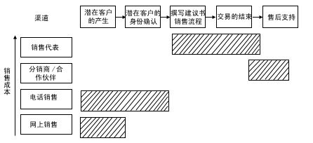 渠道整合強調(diào)在一個銷售過程中分工的不同給企業(yè)帶來更多的利潤,將銷售過程的任務(wù)一一分配給不同成本的渠道來完成。銷售過程的中間環(huán)節(jié)——面對面的銷售和交易的達成,通常需要由成本較高的區(qū)域銷售代表和分銷伙伴來完成,客戶的產(chǎn)生及身份的確認和售后服務(wù)環(huán)節(jié)通常由低成本渠道完成。現(xiàn)在,我們對照圖4來比較一下: