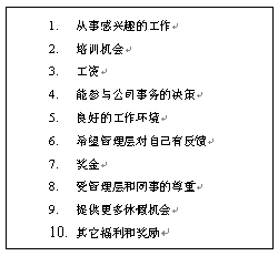 10. 來自公司高層的認可。這是一個非常有效的作法,能得到公司高層的認可對很多人來說,是一生都可以值得回憶的事情。如果在一家全球的大公司,和公司CEO共同進餐,得到公司CEO的親筆信,和CEO合影等都是非常高的榮譽。當(dāng)然,這個作法不是可以經(jīng)常用的。因為,如果用得太經(jīng)常了,就可以失去了一種"神秘感"或"來之不易"的感覺。