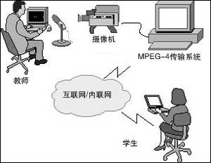 對(duì)于需要上課的學(xué)生,可以利用MPEG-4交互教學(xué)系統(tǒng),在自己的家里觀看教師講課,不但能看到教師,還可以同步看到教師計(jì)算機(jī)屏幕上的講義。如果在學(xué)生家里的計(jì)算機(jī)上安裝了麥克風(fēng)和攝像頭,還可以進(jìn)行視頻交流,“面對(duì)面的”溝通。學(xué)生可以“舉手”回答老師的問(wèn)題,學(xué)生之間可以討論,老師可以進(jìn)行網(wǎng)上測(cè)驗(yàn)。