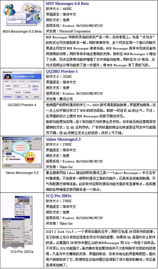 筆者最近試用了上述兩款最新軟件及并對它們及另外兩款著名IM軟件:ICQ和Yahoo Messenger進(jìn)行了評測。