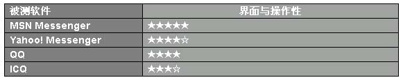 對于IM類軟件來說,網(wǎng)友希望其界面在精美的同時越簡單越直接越好。在這一點上,MSN Messenger最為突出,界面精致,操作極易上手,在本次評測中獲得一致認(rèn)可,位列第一;Yahoo! Messenger操作上也比較直觀,只是“做工”顯得有些粗糙;被測的QQ2003剛剛在界面上做了重大的改變,只是稍顯零亂,對MSN的部分借鑒比較成功,對于一個新用戶來說最基本的功能的使用還算方便;ICQ功能的確強大,界面有些老舊,(ICQ Lite可以改變這一切,但是ICQ Lite僅僅是ICQ的一個插件版本,本次評測沒有考慮),ICQ操作對中文用戶來說也過于繁復(fù)。