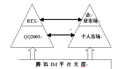 1、從QQ2003到RTX是對IM市場的全方位介入。騰訊推出革命性的QQ2003,緊接著又啟動RTX新品牌進(jìn)軍企業(yè)市場,標(biāo)志著其不滿足于將自身定位為娛樂及時(shí)信息平臺和服務(wù)提供商,而是對商務(wù)市場和個人市場進(jìn)行理性細(xì)分后的一種戰(zhàn)略決策,向兩類不同的用戶推出不同的品牌,提供不同的服務(wù)(如下圖),既保證了不同用戶的需求特質(zhì),又有效避免了品牌混亂。