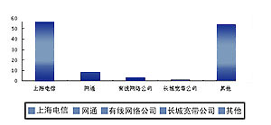 在國內,視訊市場的形成已經初露端倪,眾多商家都開始瞄準這個新的利潤增長點。2002年8月,上海電信正式將視訊業(yè)務命名為“新視通”,并陸續(xù)開通了上海至美國洛杉磯、新疆烏魯木齊、石河子、克拉瑪依等地區(qū)的公眾視訊業(yè)務,同時還針對商用客戶和個人用戶啟動了推廣計劃。由于上海是我國的貿易、金融、經濟中心,許多國內外的大型企業(yè)都在上海設有分支機構,市場潛力不可估量,眾多運營商都在爭取上海的市場。目前,除了上海電信推出的“新視通”業(yè)務外,網通、有線網絡和其它公司都在上海推出了自己的視訊系統(tǒng)。根據我們對企業(yè)用戶的抽樣調查,下圖的市場占有率表明了視訊業(yè)務的競爭將會日益激烈。