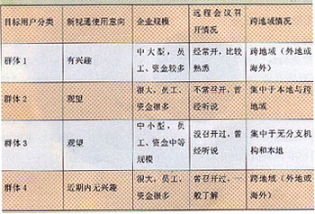 根據前一階段我們做的視訊業(yè)務市場研究,目前的主要目標客戶可以定位為以下范圍:對于“新視通”會議系統(tǒng)感興趣的客戶,需要觀望的客戶以及雖然不感興趣但企業(yè)規(guī)模較大、存在著一定會議需求卻對遠程會議不了解的客戶。通過對目標群體的進一步細分,我們將客戶聚類為四個主要群體: