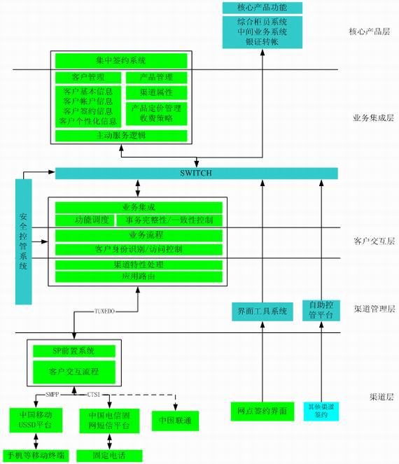 3) SP前置系統(tǒng)實(shí)際包括兩個(gè)部分:一是針對(duì)具體渠道的協(xié)議轉(zhuǎn)換,二是對(duì)簽約系統(tǒng)中制定的產(chǎn)品要素流程的具體交互控制。由于USSD接入模式的特性(面向?qū)崟r(shí)連接)和手機(jī)終端表達(dá)能力的限制,客戶(hù)在手機(jī)上對(duì)每個(gè)產(chǎn)品的每個(gè)交互步驟的控制均由SP前置系統(tǒng)控制。在設(shè)計(jì)和實(shí)施中除去與移動(dòng)USSD平臺(tái)的SMPP協(xié)議轉(zhuǎn)換部分,SP前置實(shí)際上是一個(gè)通用的交易交互流程控制系統(tǒng),能夠保持客戶(hù)在具體渠道終端上的交易流程狀態(tài),并交互式的向渠道終端提供交易序列。SP前置的交互流程控制通過(guò)與不同渠道的內(nèi)容管理組件的配合,可以提供基于文本、語(yǔ)音、圖形、圖象等不同表現(xiàn)形式的業(yè)務(wù)流程,可以方便的將業(yè)務(wù)集成系統(tǒng)包裝的產(chǎn)品實(shí)現(xiàn)在諸如多媒體終端、電話銀行、電視銀行等渠道上。