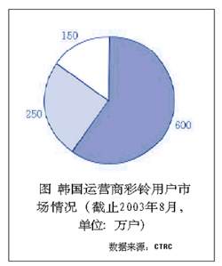 彩鈴業(yè)務(wù)最先是由韓國(guó)的SK電信于2002年3月推出的,業(yè)務(wù)一經(jīng)面世就吸引了移動(dòng)用戶、特別是年青用戶群體的眼球,開通的用戶數(shù)和業(yè)務(wù)使用率呈指數(shù)式增長(zhǎng);同時(shí)由彩鈴業(yè)務(wù)帶來(lái)的互聯(lián)網(wǎng)、WAP和IVR的話務(wù)量的增長(zhǎng)進(jìn)一步提升了彩鈴業(yè)務(wù)的含金量。隨后韓國(guó)的其他兩個(gè)移動(dòng)運(yùn)營(yíng)商LG電信和韓國(guó)電信也分別于2002年6月和9月相繼開通彩鈴業(yè)務(wù)。經(jīng)過運(yùn)營(yíng)商和彩鈴的內(nèi)容提供商的前期市場(chǎng)推廣和運(yùn)作,目前已發(fā)展了近1000萬(wàn)用戶,其中運(yùn)營(yíng)商的市場(chǎng)份額如圖所示。