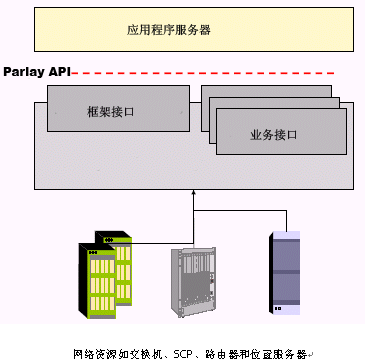 Parlay/OSA設(shè)想應(yīng)用程序運(yùn)行在應(yīng)用服務(wù)器上,通過TCP/IP連到Parlay/OSA網(wǎng)關(guān)。