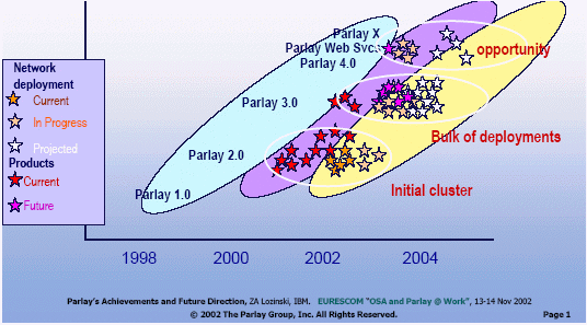 2003年5月底,世界上已經(jīng)有45個(gè)業(yè)務(wù)提供商正在使用Parlay 3.0或正準(zhǔn)備采用Parlay技術(shù)。