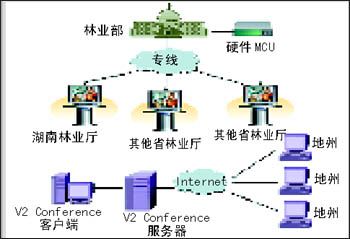 湖南省林業(yè)廳是省政府行業(yè)電子政務系統(tǒng)的示范單位,非常重視計算機網(wǎng)絡平臺上的各種軟件應用。為了減少會議支出,提高辦公效率,湖南省林業(yè)廳經(jīng)過廳務會研究決定,希望充分利用全省十四個地州市現(xiàn)有的計算機和音響設備建立全廳的網(wǎng)絡視頻會議系統(tǒng)。在經(jīng)過公開競標后,V2產品憑借著其優(yōu)越的性能價格比和售后服務保證,成功中標。