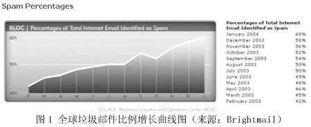 圖1來(lái)自著名的反垃圾郵件先鋒Brightmail公司的網(wǎng)站,顯示了最近12個(gè)月來(lái),全球范圍內(nèi)垃圾郵件在所有郵件中所占比例的增長(zhǎng)曲線圖。按Brightmail的統(tǒng)計(jì)結(jié)果,2003年3月,垃圾郵件在全球郵件總量中的比例是45%,其后的一年間,平均每個(gè)月增長(zhǎng)兩個(gè)百分點(diǎn)。到了今年2月,這個(gè)比例已經(jīng)達(dá)到62%,也就是說(shuō),現(xiàn)在全球每5封電子郵件中就有3封是有害無(wú)益的垃圾郵件。