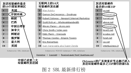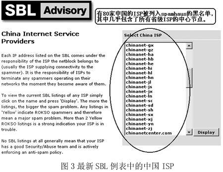 圖2是國(guó)際上著名的反垃圾郵件組織Spamhaus在網(wǎng)站上列出的統(tǒng)計(jì)排行榜,“China”已經(jīng)穩(wěn)居第二大垃圾郵件發(fā)送國(guó)的位置,而右邊的一個(gè)排行榜則從另一個(gè)角度向我國(guó)敲響了警鐘——在專為發(fā)送垃圾郵件的ISP所列的黑名單SBL中,我國(guó)Chinanet的兩個(gè)省級(jí)ISP在前10名中分列第2和第5名。而Chinanet作為中國(guó)的公用信息互聯(lián)網(wǎng)絡(luò),是我國(guó)的Internet骨干網(wǎng),是國(guó)內(nèi)用戶接入互聯(lián)網(wǎng)的主要途徑之一。“我們真不希望以這樣的方式‘揚(yáng)名海外’”,來(lái)自一家ISP的一位不肯透露姓名的女士說(shuō),“其實(shí)我們也是受害者!”